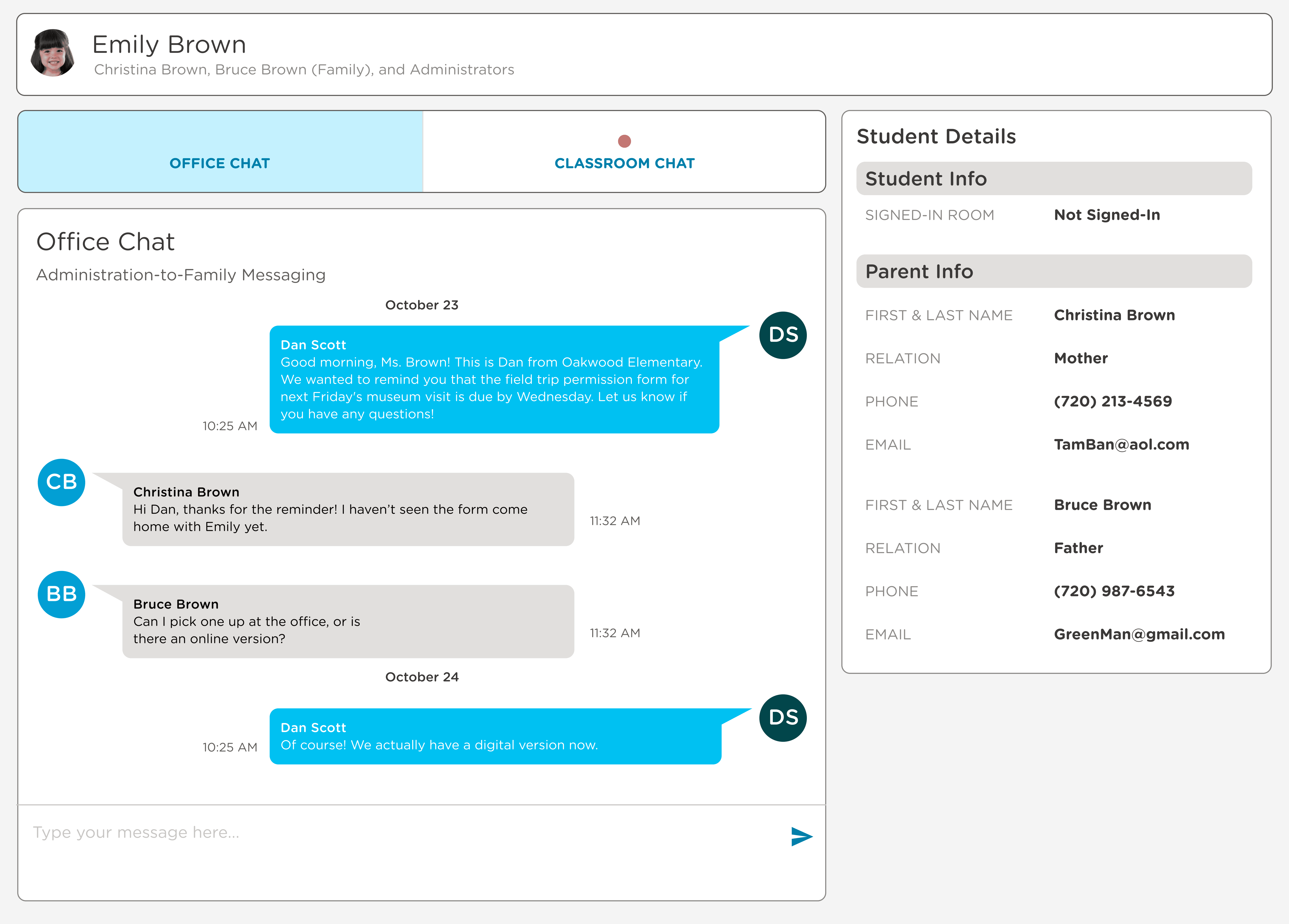 The tab label tells a parent who they're reaching before they type anything. Office Chat = administration. Classroom Chat = their child's teacher. The label tells parents exactly who they're reaching before they tap.