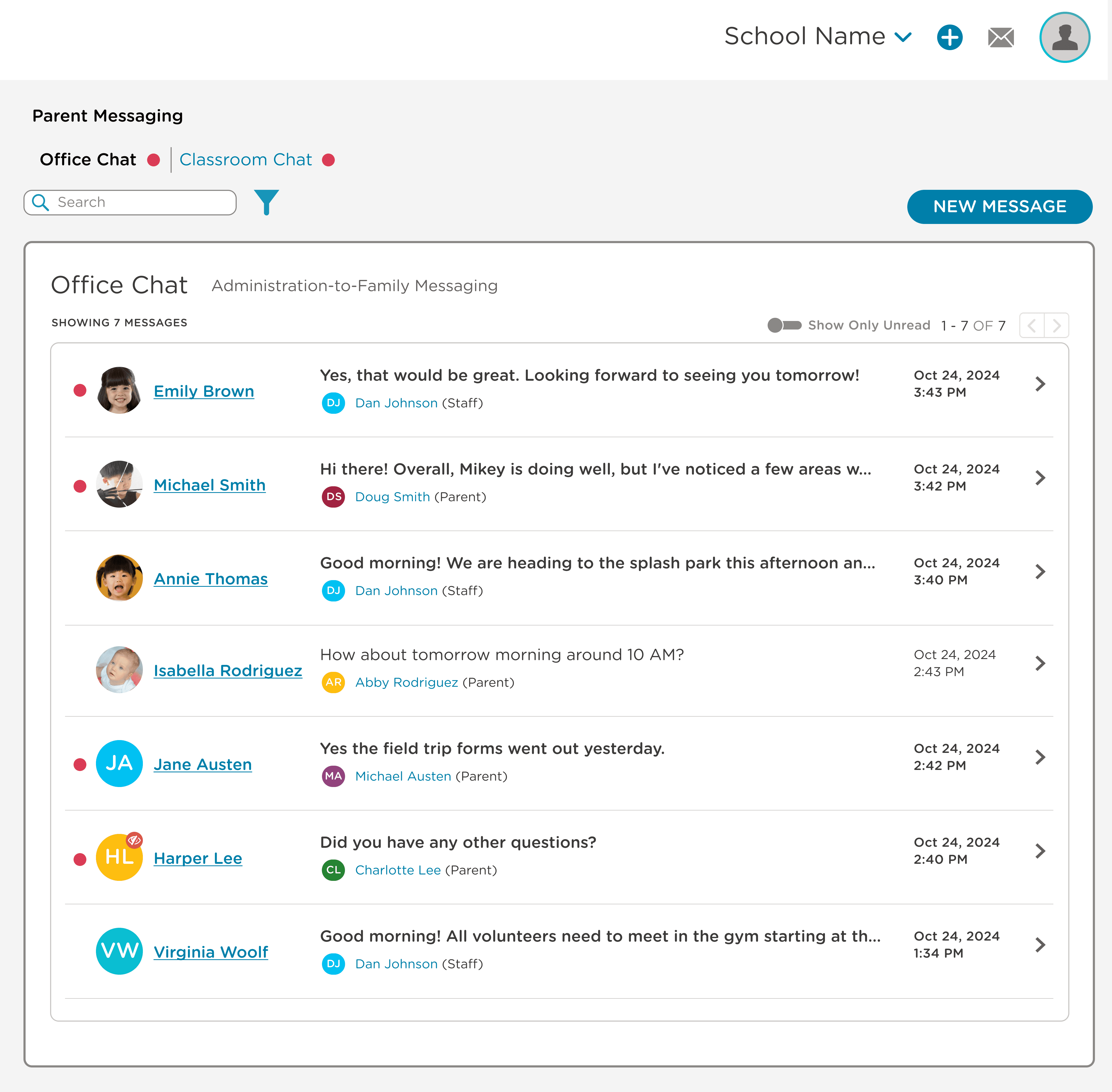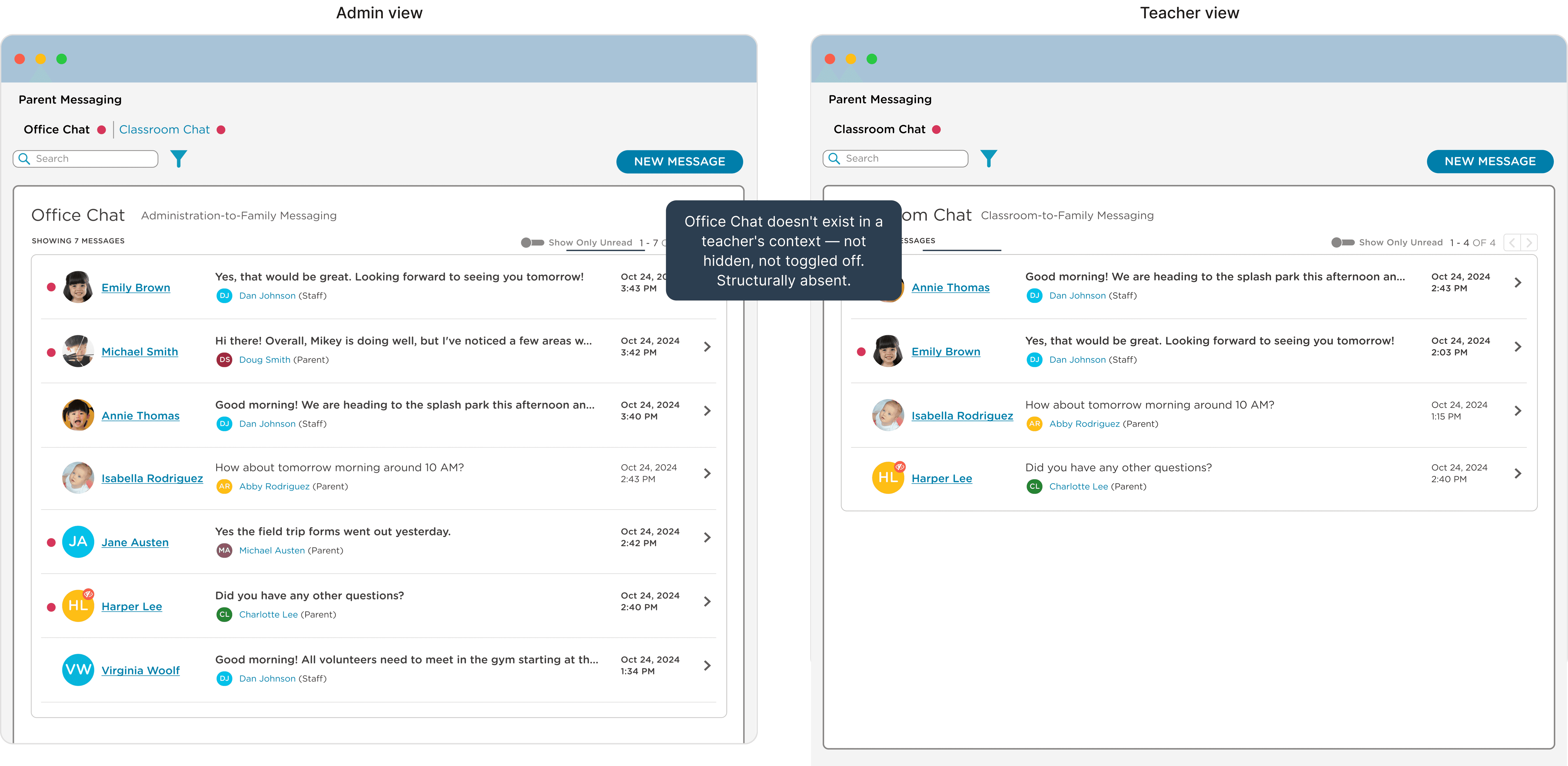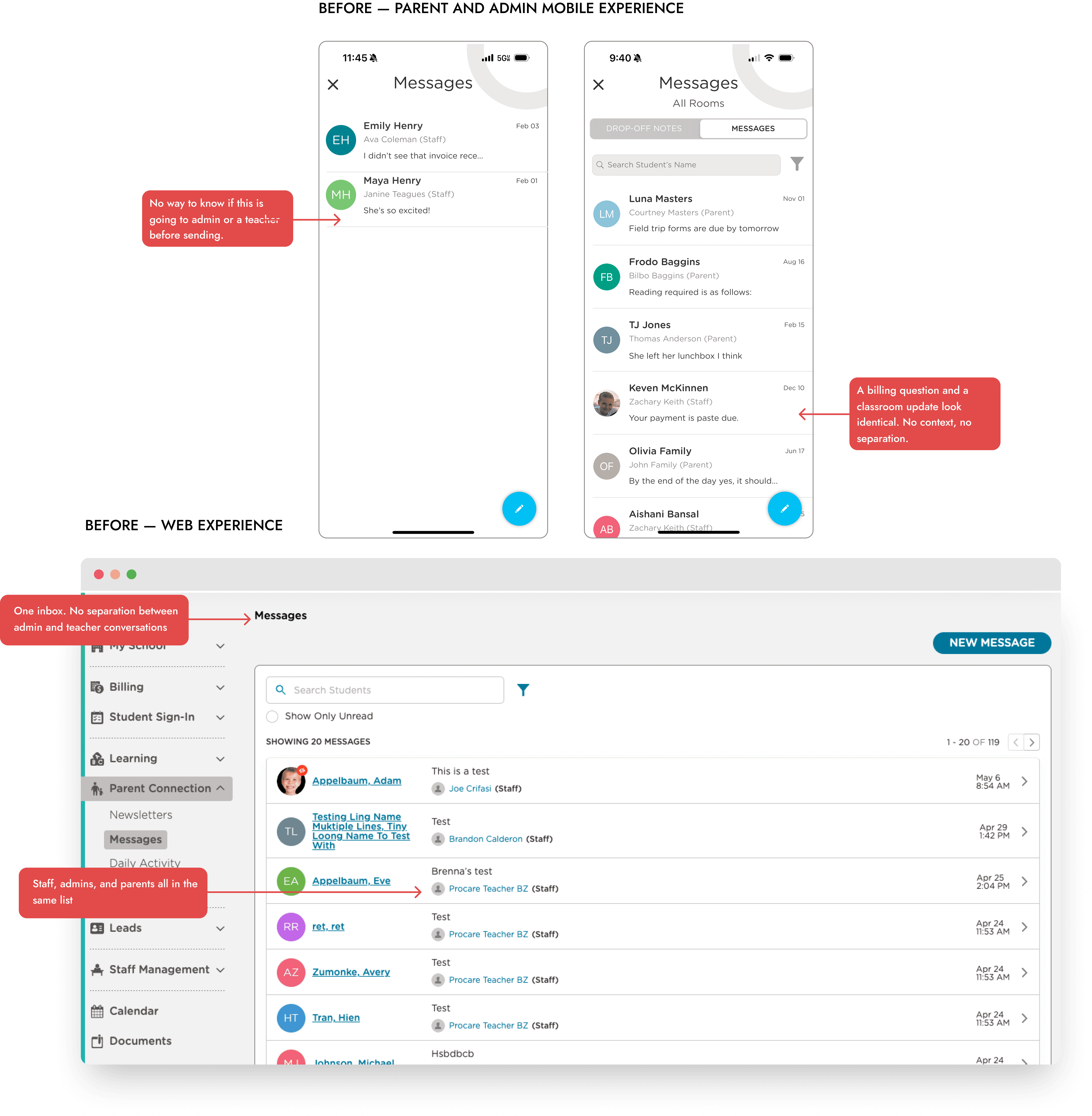 The existing system had one messaging area with no role separation. Directors had no way to message parents privately about billing, behavior escalations, or enrollment without that conversation being visible to their own staff. Everything lived in the same flat list, which meant sensitive conversations either happened in the product without privacy, or got routed out to email instead.