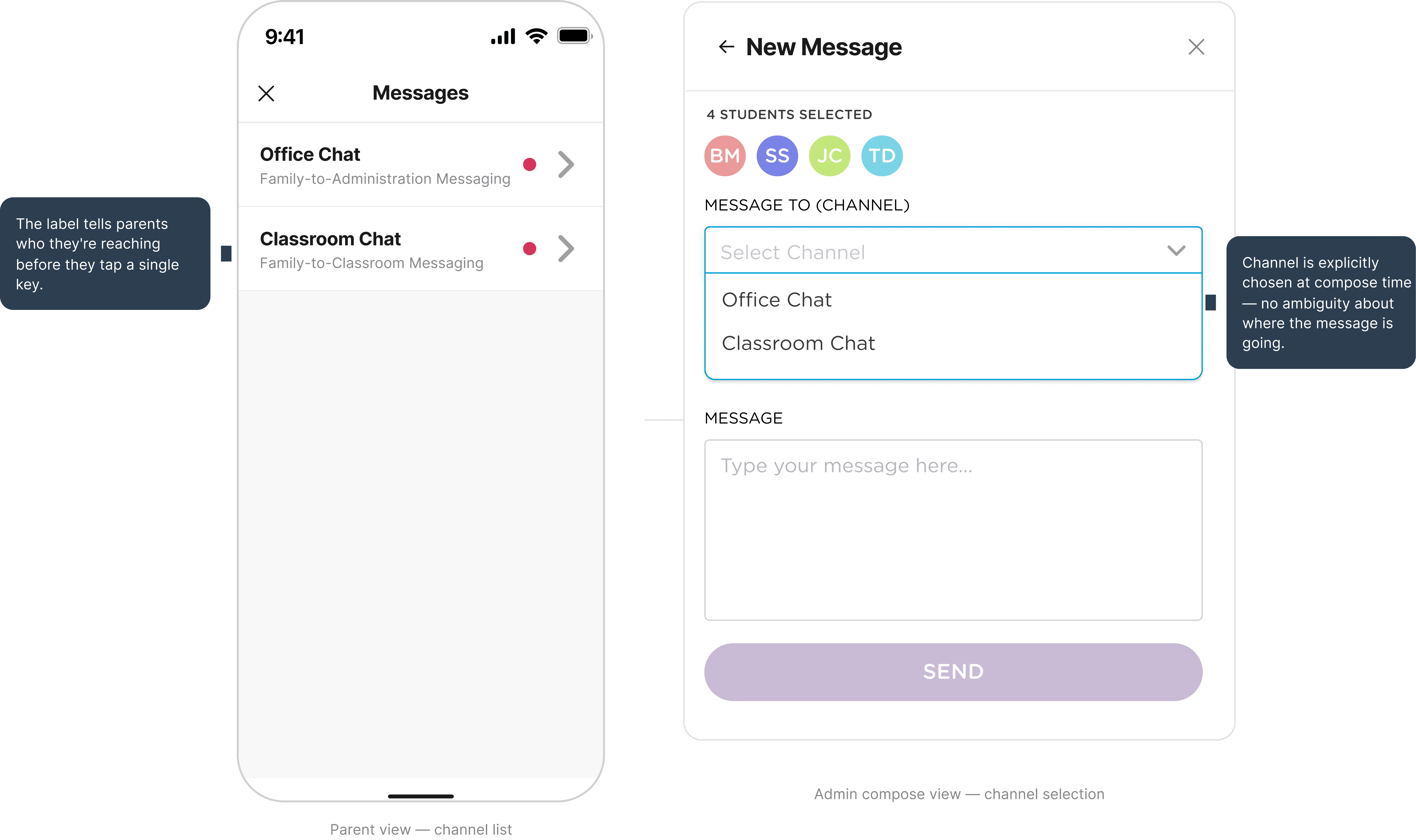 Redesigning how parents, teachers, and admins communicate with role-based channels that protect privacy without sacrificing connection.