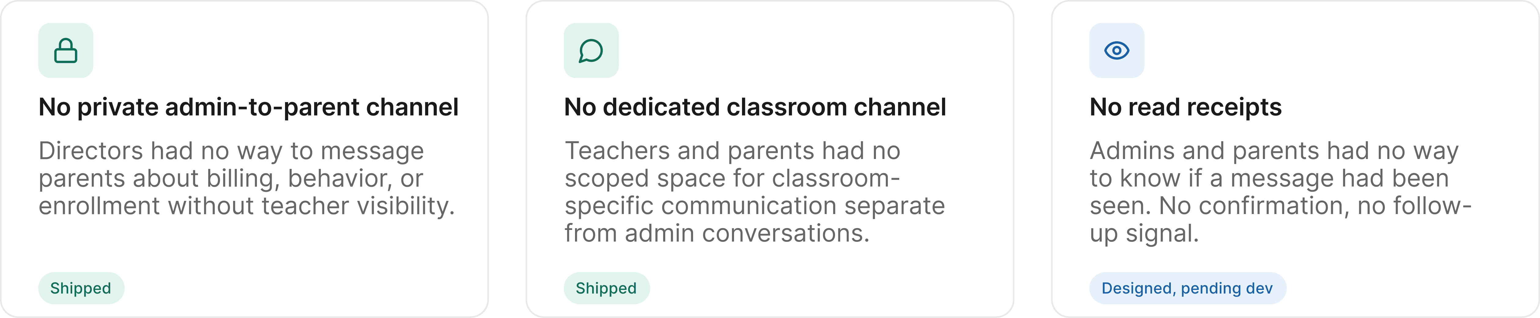 Directors needed a private channel for sensitive conversations: billing, behavior escalations, enrollment. This was less about security and more about trust and role clarity. They didn't want to route those conversations outside the product. They just needed a place inside it that teachers couldn't see.