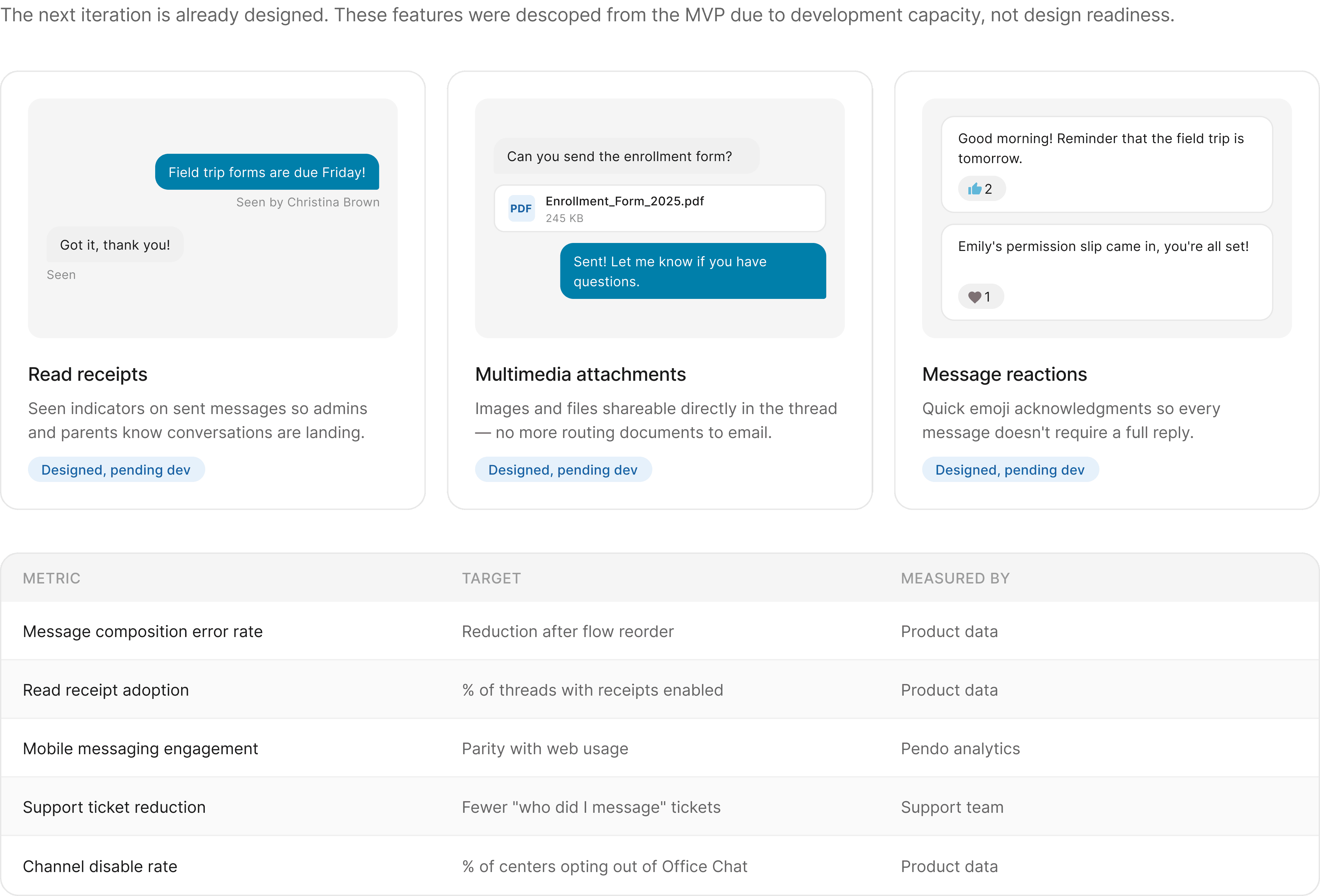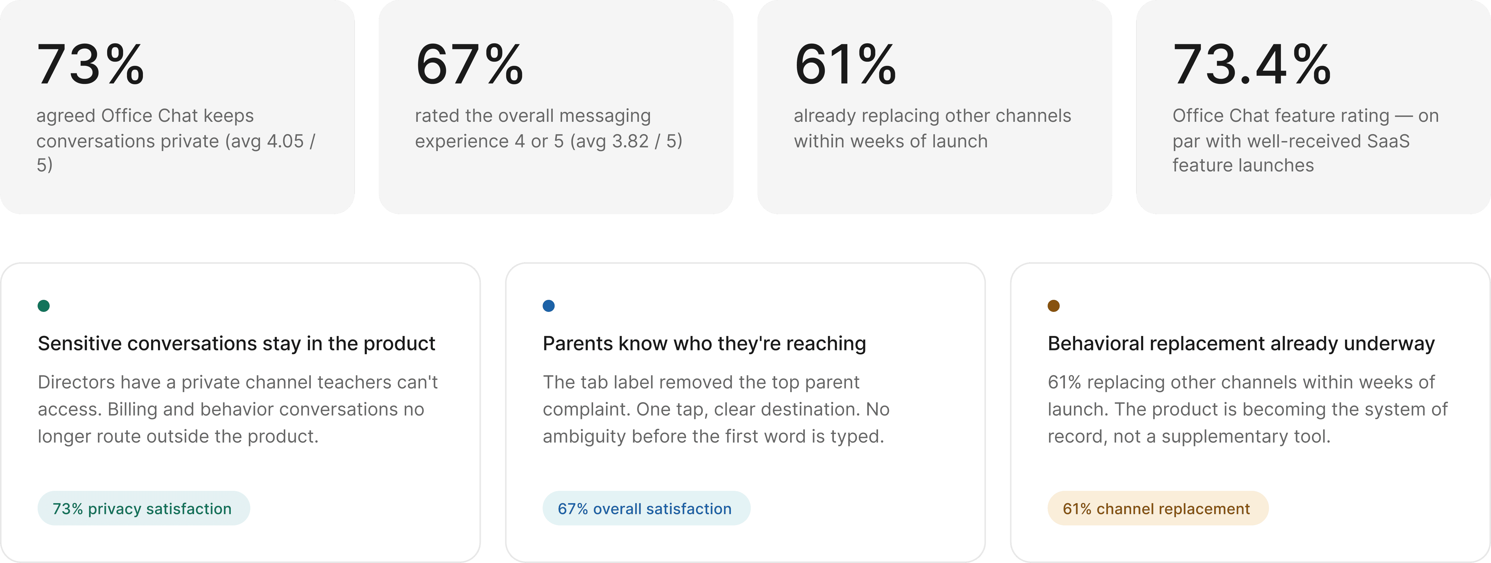 Privacy satisfaction scored higher than overall satisfaction in post-launch testing. Directors and parents trusted the channel separation before they fully trusted everything else about the feature. The structure worked before everything else caught up.