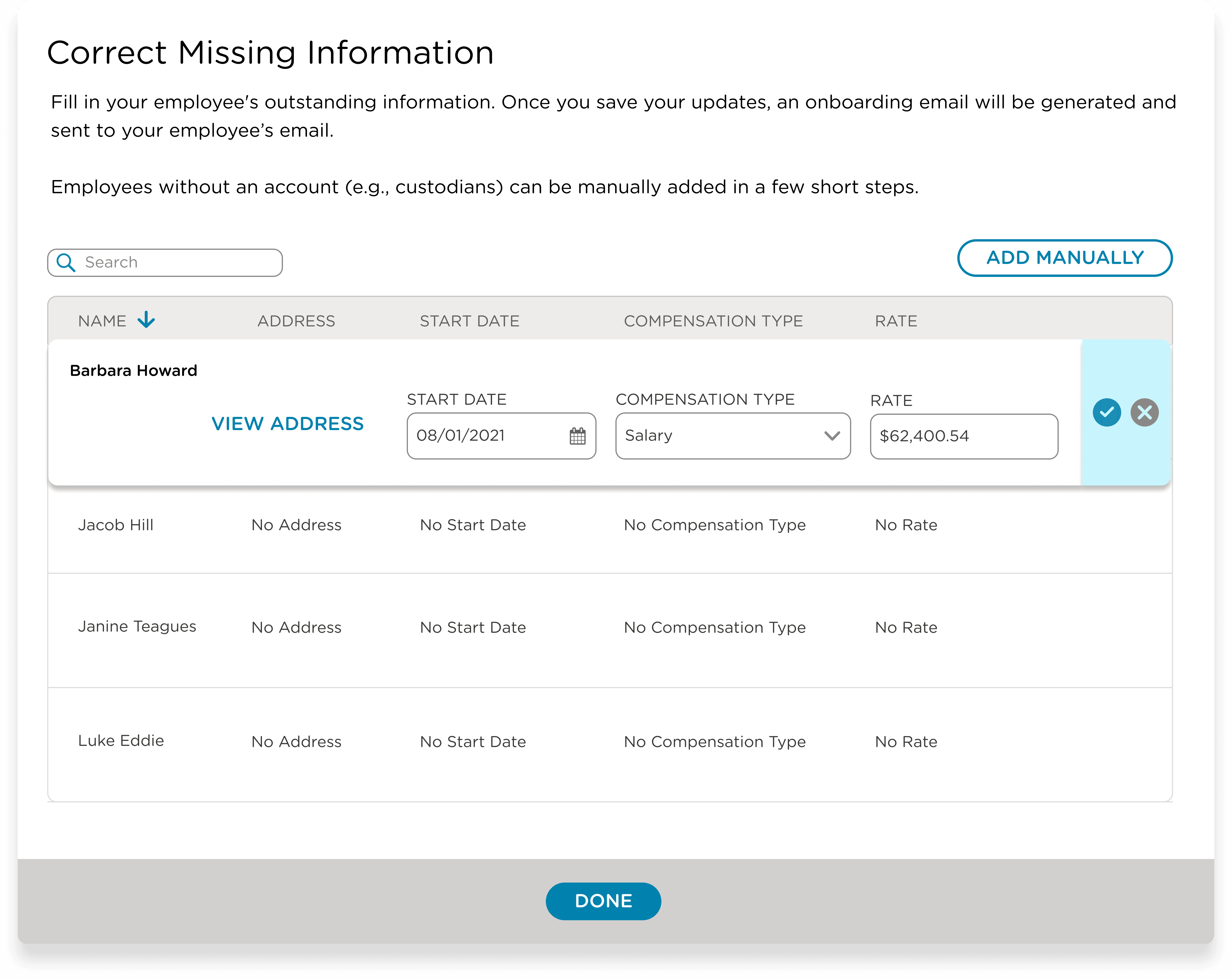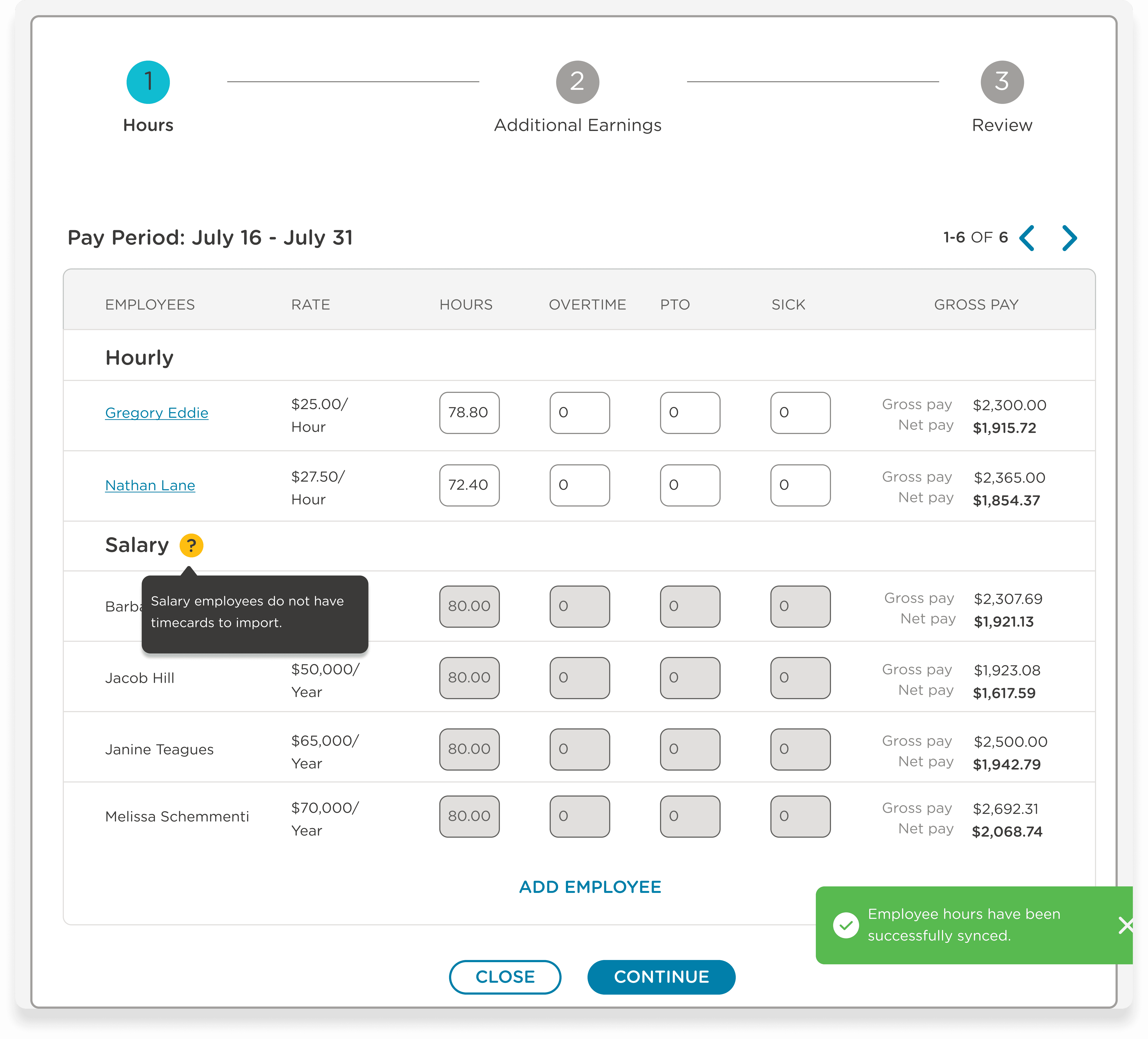 Timecard sync wasn't available in Phase 1. Rather than blocking admins from running payroll, I designed a modal that surfaced employees with incomplete data and let admins resolve it inline before proceeding. The workflow kept moving. The data gap was visible and solvable, not hidden or blocking. It also set up a clean handoff to Phase 2, where sync would eliminate the need for the step entirely.