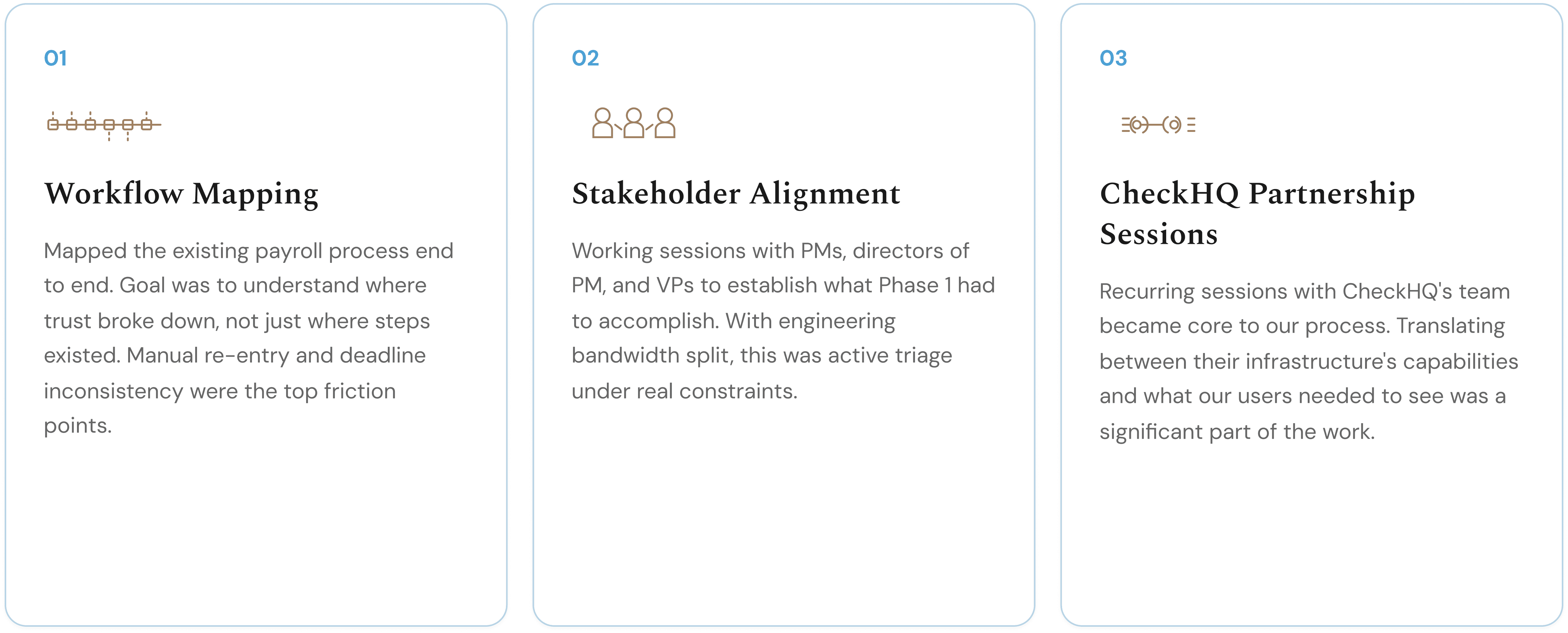 What we didn't fully anticipate was how much untangling each CheckHQ connection point would require. Components described as ready needed significantly more work to implement. We held recurring sessions with CheckHQ's team throughout. They were collaborative and responsive. But the complexity was real.