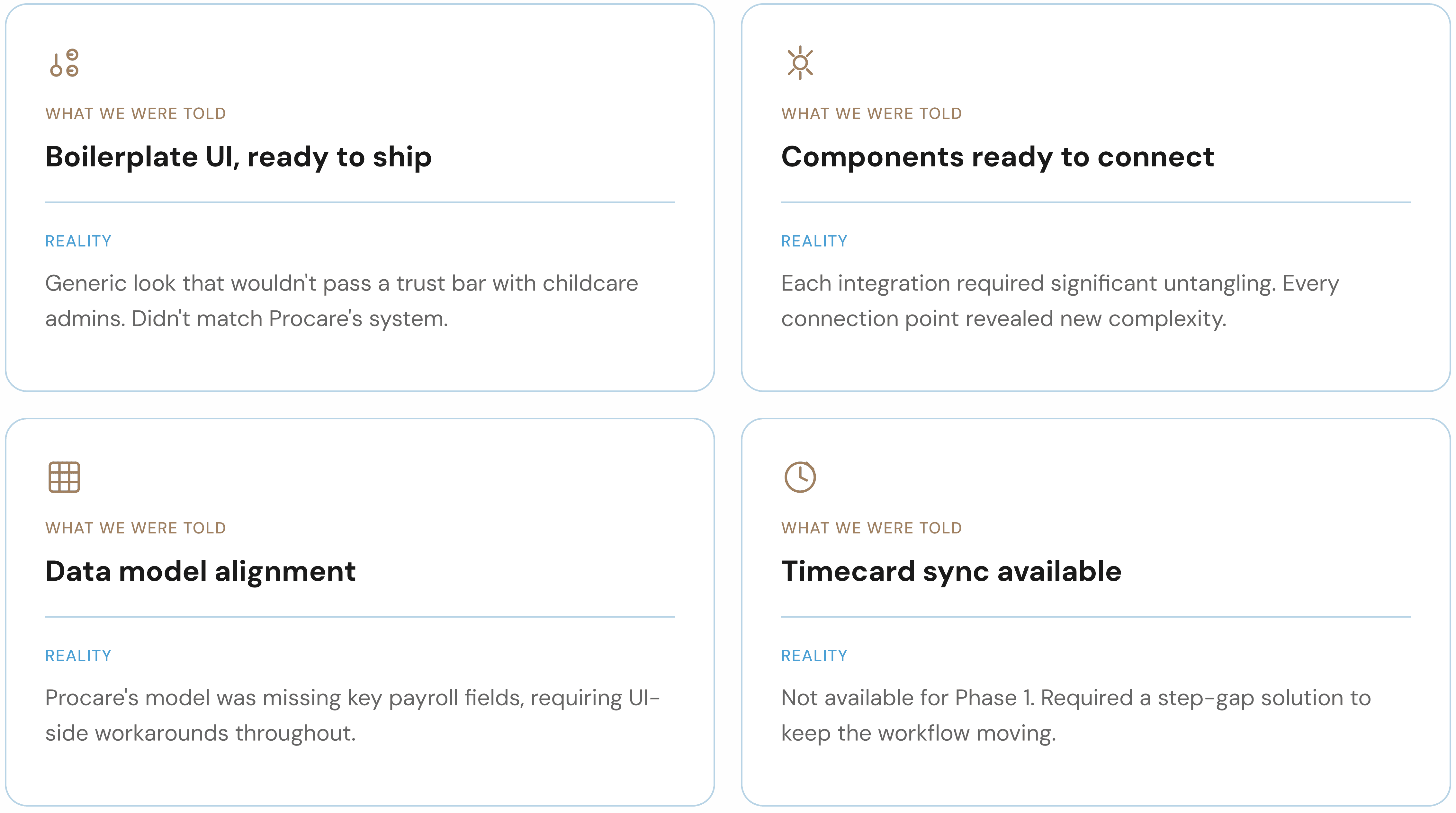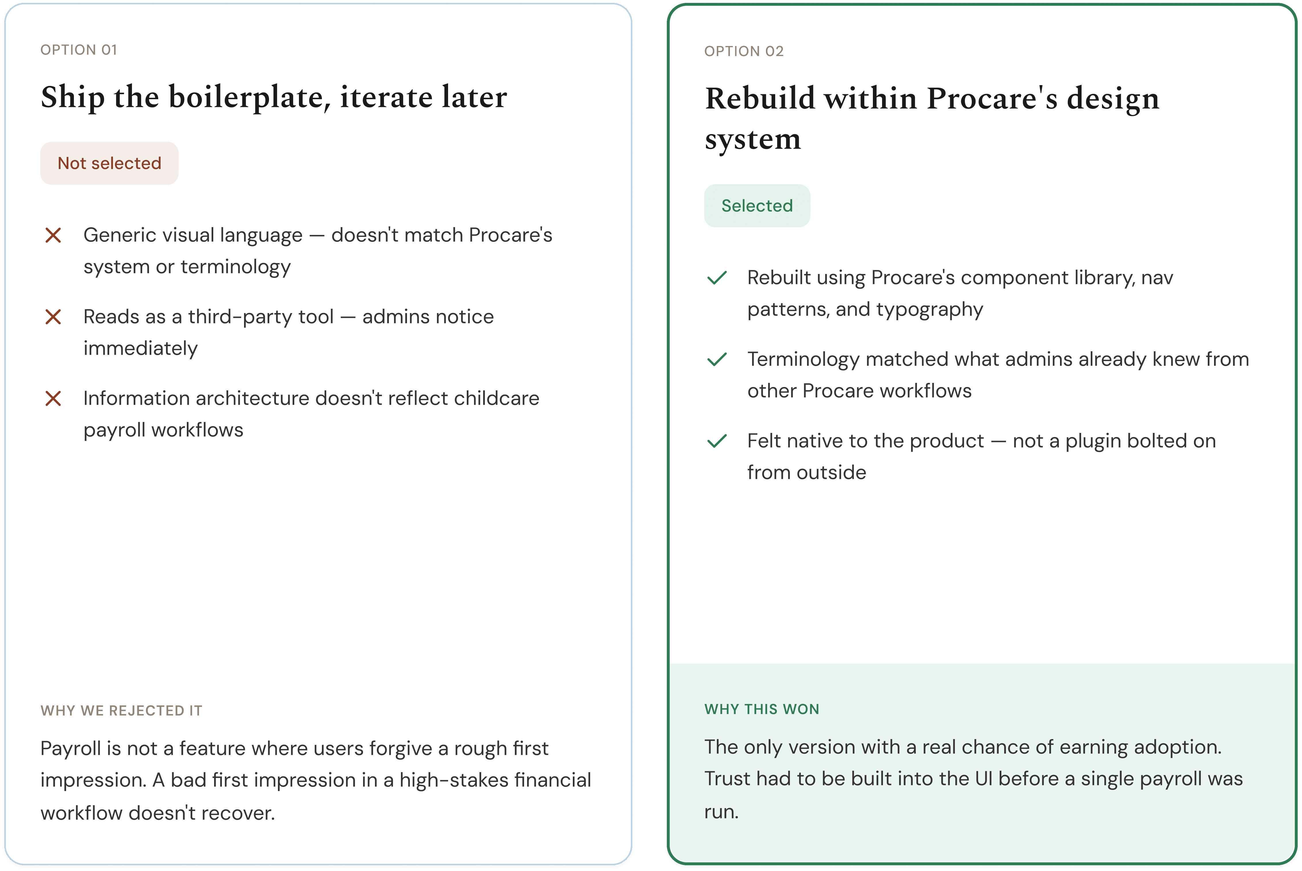 My tri-team and I pushed back. The template looked like a third-party product because it was one. It didn't match Procare's design system, terminology, or information architecture. Childcare admins running payroll for their staff needed to trust what they were looking at. The boilerplate wasn't going to get us there. We held that line.
