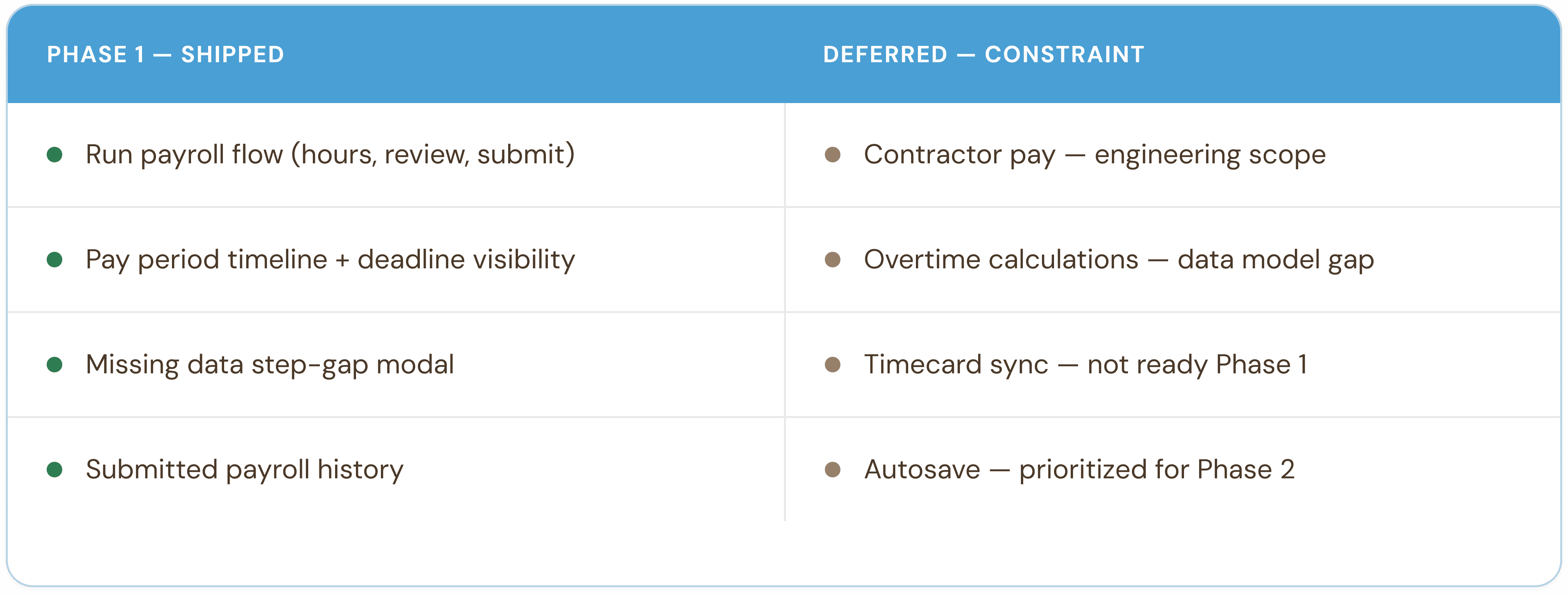 When engineering constraints required cutting contractors, overtime, sync timing, and autosave from Phase 1, leadership made the call. But I contributed a design perspective on what the MVP needed to feel coherent and trustworthy, separate from what was technically possible. There is a difference between a feature that is missing and an experience that feels broken. I advocated for keeping the elements that were load-bearing for trust and flagged the ones whose absence would create confusion rather than just inconvenience.